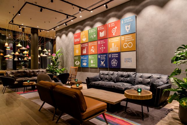 Das Interieurdesign wird bestimmt durch die 17 Ziele für nachhaltige Entwicklung (Sustainable Development Goals) der UN, die alle Gäste auf großen bunten Tafeln direkt am Eingang begrüßen. Gedruckt wurden sie auf recyceltem Material und lenken die Aufmerksamkeit auf diese weltweit so wichtigen Ziele.