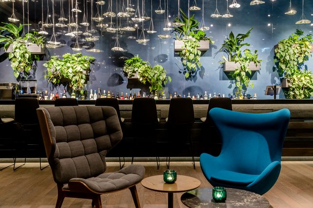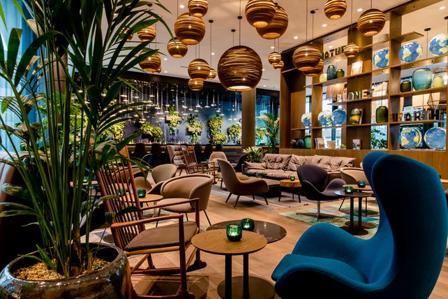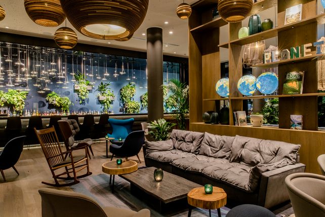 Natürliche und nachhaltige Materialien und Möbel prägen das Interieur – darunter Pendelleuchten aus PET-Flaschen oder recycelten Kartonagen und Teppiche aus Webresten. Die Rezeption und Bar verschmelzen über eine Theke aus reyceltem Altholz ineinander. Die Blautöne der Rückwand sollen dabei an die Tiefen der Ozeane erinnern, eine dreidimensionale Lichtinstallation davor nimmt die Form einer Welle auf.