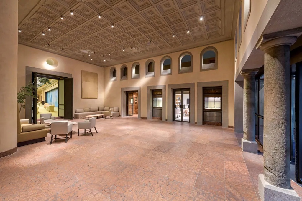 Die Wände wurden mit klassischem Lehmputz gestaltet, während die Rezeption aus europäischem Nussbaumholz gefertigt wurde. Antike Säulen aus Italien und Elemente aus Fertigbeton sollen dem Raum eine zeitlose Tiefe verleihen. Eine neu eingezogene Kassettendecke schließt die Fassade nach oben ab und erzeugt die Atmosphäre eines überdachten Innenhofs. Im Zuge der Maßnahmen wurde zudem das Treppenhaus zum erweiterten Emporen Café angepasst.