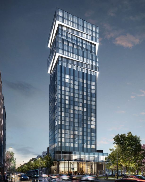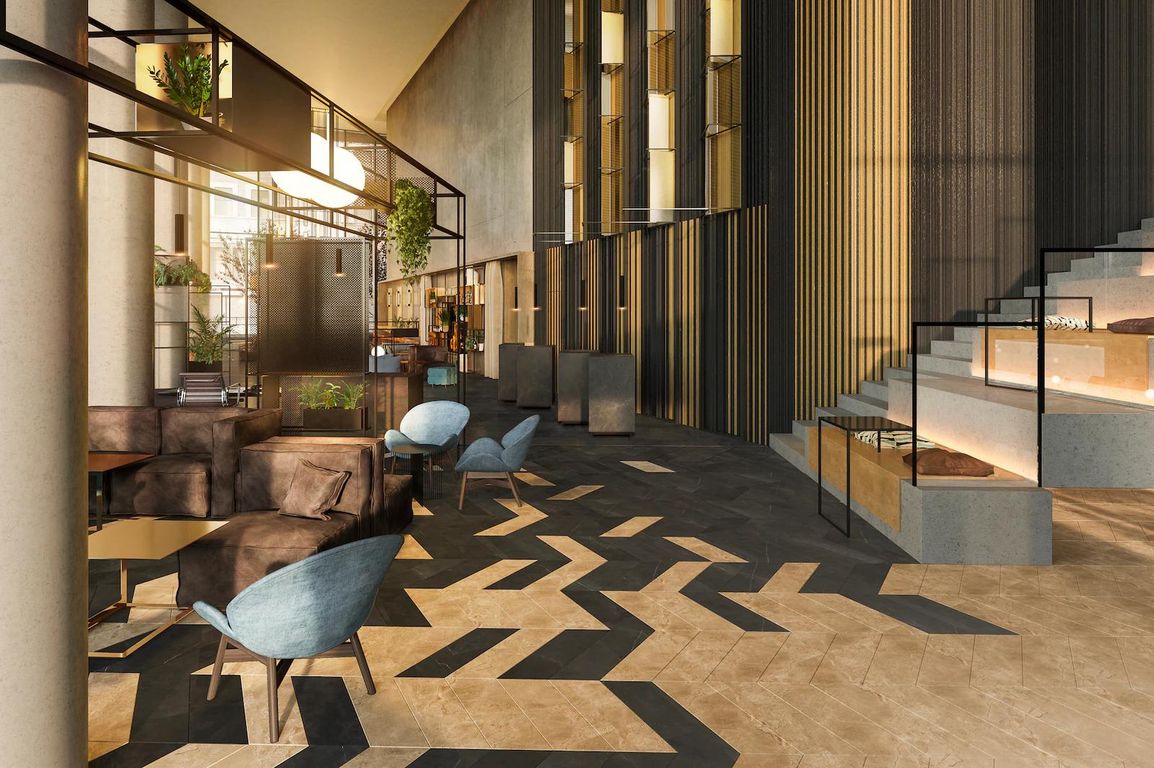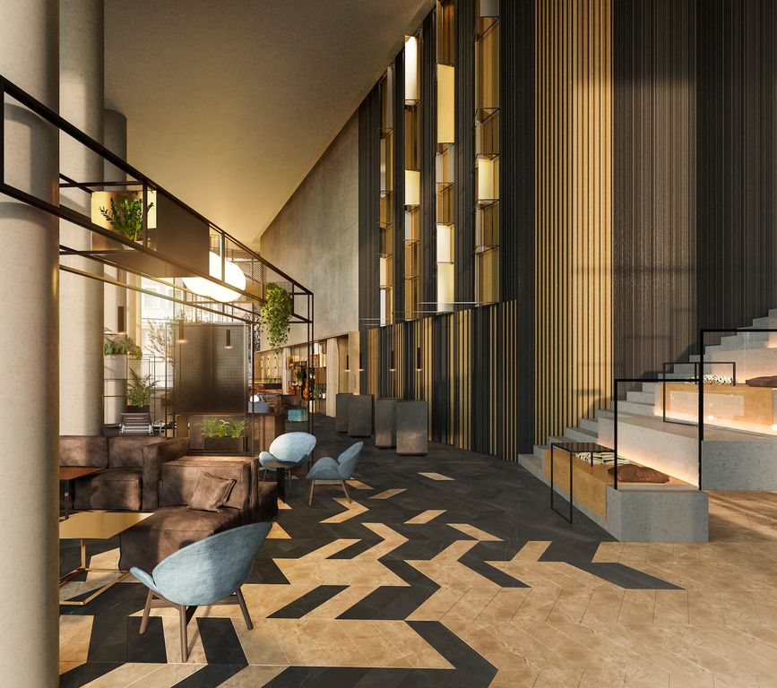 Im Inneren setzen die elf Meter hohe, lichtdurchflutete Lobby mit ihren großen Fensterelementen und eine breite Treppe mit Sitzgelegenheiten bis hinauf in die zweite Etage architektonische Akzente. Die öffentlichen Bereiche wie die Lounge und die Lobby-Bar laden als trendiger Treffpunkt im Zentrum Frankfurts ein. Von der Dachterrasse im 32. Stockwerk genießen Gäste einen imposanten 360-Grad-Blick auf die Stadt.