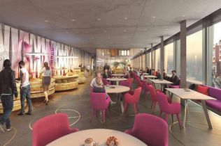 Auch im Restaurant Kantine im ersten Stock finden sich poppige Mural-Elemente wieder. David Zuker entwarf hierfür surrealistische, fantasievolle Währungen als Wandmotiv, welche die Portraits von Sissi, Nofretete, Goethe oder Beethoven zieren.