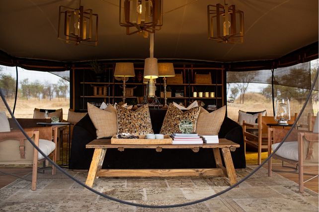 Die Zelte bestehen aus recyceltem Material und wurden in Tansania gefertigt. Die gespannten Wand-Elemente sind handgenäht; das achteckige Schattennetz reicht bis zum Boden und die Seitenwände sind transparent, um die Grenzen zwischen Natur und Mensch aufzuheben und auf diese Weise den Gästen die wilde Serengeti noch näher zu bringen. Sämtliche Einrichtungsgegenstände sind Maßanfertigungen von Vaun Interiors in Johannesburg, Südafrika. Da es sich um ein mobiles Camp handelt, wurden die meisten Gegenstände so gestaltet, dass sie sich einfach zusammenklappen und entsprechend verpackt leicht transportieren lassen.