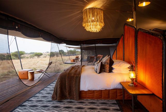 Das Camp nach Beduinen-Art besteht aus acht Zelten, die auf erhöhten Plattformen errichtetet einen ungetrübten Blick auf die wilde Landschaft der Serengeti haben. Jedes Zelt bietet Platz für zwei Personen, für Familien und Kleingruppen können zwei Zelte zu einem Viererzelt verbunden werden. Jedes Zelt verfügt über ein eigenes Badezimmer mit Doppelwaschtisch. Komplettiert wird das Camp durch ein separates Speisezelt und ein Lounge-Zelt mit einer Auswahl an Bildbänden und Brettspielen.