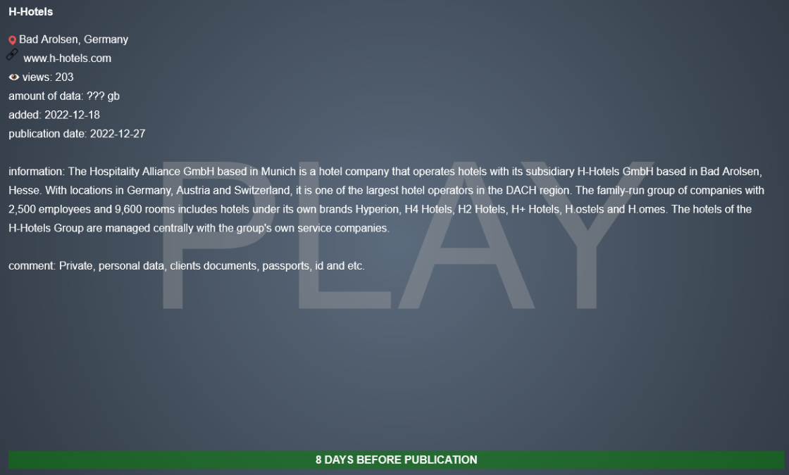 Nun hat Play Ransomware den Angriff auf H-Hotels für sich reklamiert und das Unternehmen heute auf seiner Tor-Website aufgelistet. Es wird behauptet, dass während des Cyberangriffs eine ungenannte Menge an Daten gestohlen wurde.