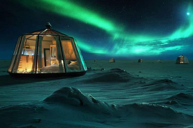 Der finnische Reiseveranstalter Luxury Action plant, ein Pop-up-Hotel am Nordpol zu errichten. Im April 2020 können Reisende in gläsernen Zelten unter Polarlicht für eine stolzen Preis schlafen: Eine Übernachtung kostet fast 100.000 Euro.