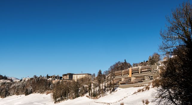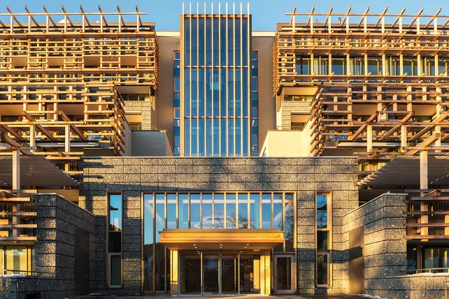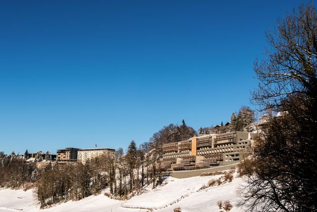 Das Waldhotel, ein Teil des Bürgenstock Resort, ist in der Tat ein Leuchturm moderner, nachhaltiger Architektur unter Berücksichtigung von Zero KM, Zero Abfall und Zero CO2. Es ist das weltweit größte Gabionen-Gebäude. Inspiriert von der Walser Baukunst und der alpinen Tradition wurden lokale Materialien verwendet. Dank seiner Terrassenstruktur und den begrünten, natürlich isolierten Flachdächern fügt sich das Waldhotel perfekt in das Landschaftsbild ein.