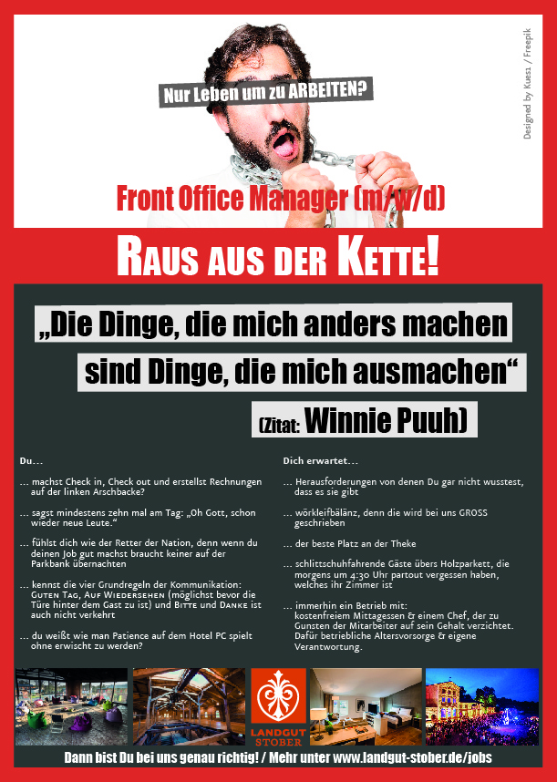 Stober hat sich von einem Kurzbeitrag im Spiegel-Magazin inspirieren lassen und einen neuen Weg bei seiner Ansprache eingeschlagen. Wo andere Hoteliers weiterhin konservativ und wenig lebendig um die Aufmerksamkeit potentieller Mitarbeiter ringen, kokettiert Stober bewusst und selbstironisch mit den Schwachstellen und Vorurteilen der klassischen Hotellerie. Bildhaft und mit einem Augenzwinkern beschreibt er, was jeder aus der Branche kennt oder bereits erlebt hat. So zum Beispiel: „Du willst einen traumhaften Arbeitsplatz aber du weißt, die Grenze zwischen Traum und Trauma ist fließend“ oder „Dich erwartet so viel Arbeit, dass du eh keine Zeit mehr für Freunde, Familie oder Kinder hast. Wozu auch - kann man doch alles im Alter genießen“. Untermalt werden die Anzeigen mit markanten, zum schmunzeln anregenden Headlines und aussagekräftigen Bildern.