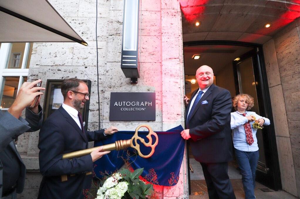 Dr. Christian Hirmer, Sprecher der Hirmer Gruppe, die als Bauherr fungierte, dankte allen beteiligten Planern und Unternehmen der Region, die engagiert den engen Zeitplan erfüllt und den erfolgreichen Abschluss der Umbaumaßnahmen erst möglich gemacht hatten. Auch die Stadt habe das Vorhaben großartig unterstützt. Von Anfang an sei spürbar gewesen, dass die Zukunft des Hotel Elephant Weimar den Bürgern der Stadt ein großes Anliegen sei. Johannes, Sohn des Hoteldirektors Andreas J. Kartschoke, durfte das goldene Band vor dem Haupteingang zerschneiden. Anschließend überreichten Dr. Christian Hirmer und seine Frau Christiane symbolisch den Hausschlüssel an das Management mit arcona-Geschäftsführer Alexander Winter, Marketingdirektorin Christiane Winter-Thumann und Andreas J. Kartschoke.