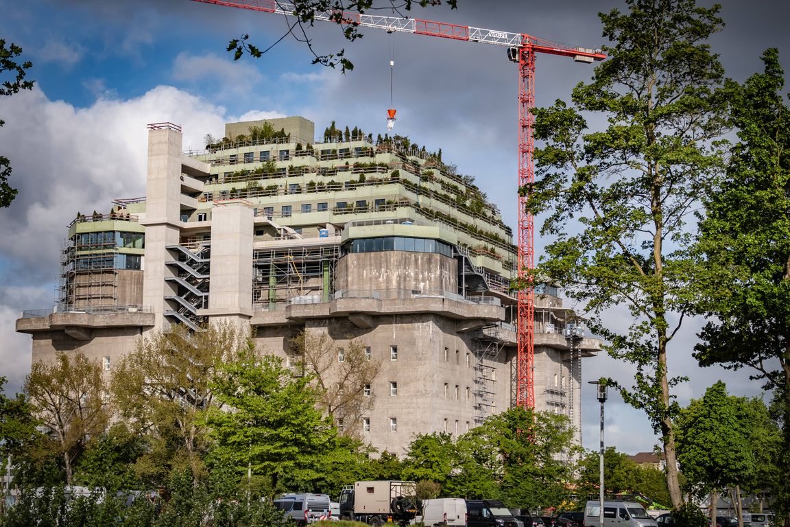 Bei einer Führung über die Baustelle geht es per Fahrstuhl hoch. Noch hängen Kabel von der Decke, Arbeiter schleppen Baumaterial durch leere Räume. Knapp vier Monate bleiben noch, dann soll in den neuen Stockwerken ein bunter Mix geboten werden. Eine Eventhalle mit illuminiertem Boden, die in drei Bereiche getrennt werden kann, lädt nicht nur zu Konzerten, sondern kann von umliegenden Schulen auch für Sportunterricht genutzt werden. Besucher des Hochbunkers können in der Bar «Karo & Paul» auf mehreren Ebenen Getränke, Snacks und Musik genießen. Auch das Café «Constant Grind» und das Restaurant «La Salsa» mit Show-Küche werden Gäste bewirten.