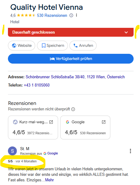 Der Google-Eintrag zeigt das Haus als geschlossen an.