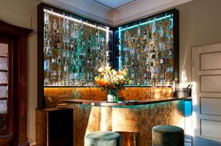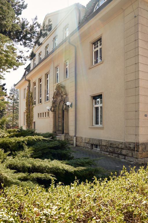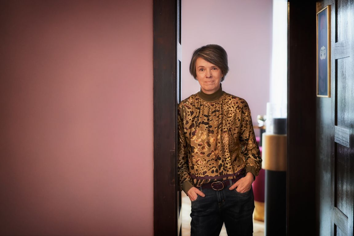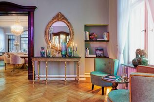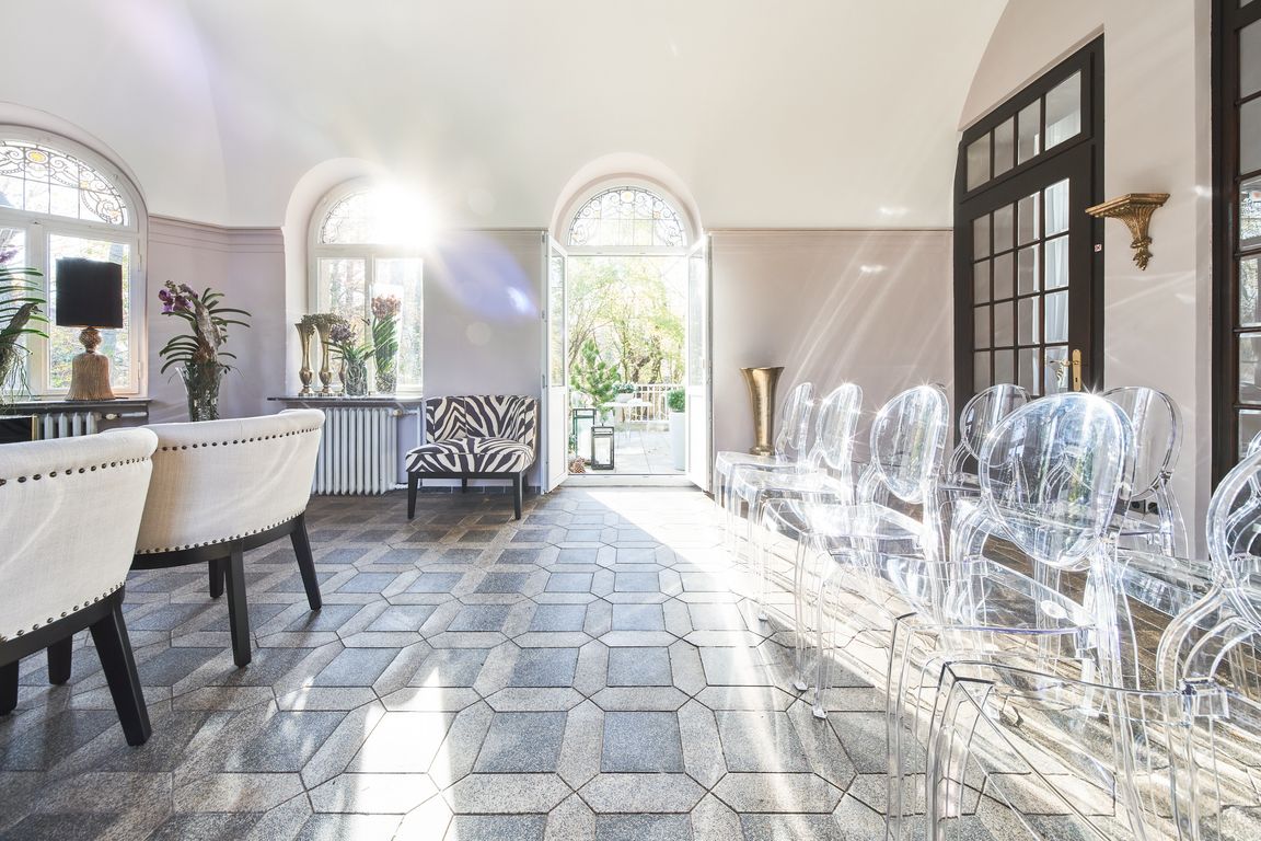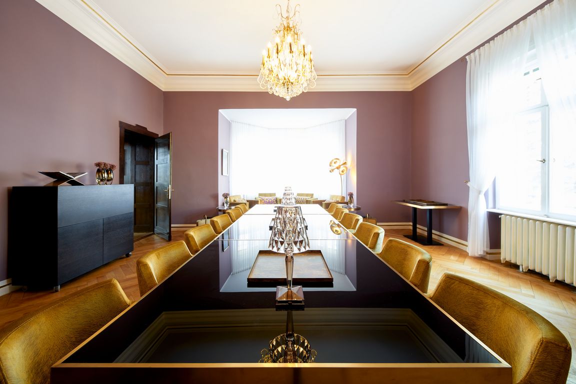 Fischgrätenparkett, ein beeindruckender Kronleuchter, weißer Stuck, dunkle Holzvertäfelungen an den Wänden, ein Kamin, Art-Deco-Mobiliar und ein repräsentativer Treppenaufgang warten auf die Gäste. „Es war gar nicht so einfach, in Zeiten einer Pandemie – in der es ja Reiseverbote und oft keine offenen Showrooms gibt – alle Möbelstücke, Dekorationen, Tapeten, Textilien ‚nur‘ online zusammenzutragen“, erklärt die Inhaberin.