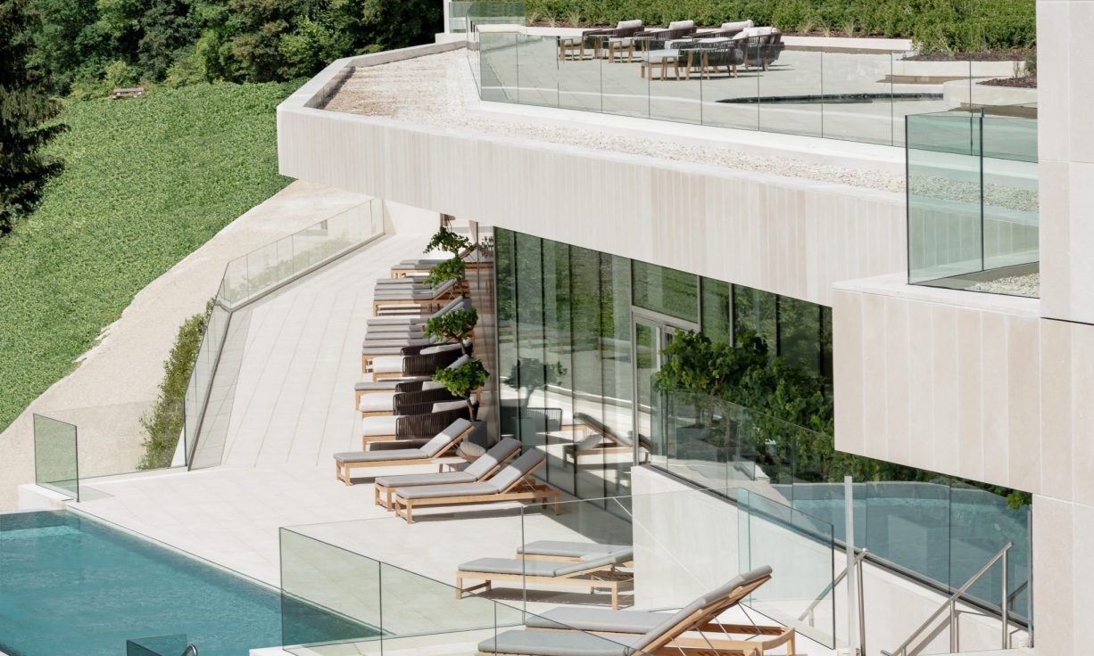 Schlicht und klar ist auch das Innendesign. Kreiert von Sybille de Margerie, einer renommierten französischen Innenarchitektin. Handgefertigte Möbel und raffinierte Details spenden ein behagliches Ambiente, weite Fensterfronten, lichtdurchflutete Räume. Das Spa erstreckt sich auf mehr als 1.500 Quadratmetern, mit einem Pool inmitten des Weinberges. Neun Behandlungssuiten bietet der ganzjährig geöffnete Spa-Bereich. Geleitet wird der Spa seit Januar 2019 von Anna Pierzack. Seit über 15 Jahren hat sie sich den Themen Wellness und Schönheit verschrieben und Erfahrungen in den USA und Asien gesammelt. Die vergangenen Jahre arbeitete sie in Paris und leitete das berühmte Anne Fontaine Spa in der Rue Saint Honoré, das My Blend by Clarins Spa im Royal Monceau Hotel und zuletzt das Spa des Mandarin Oriental Paris.