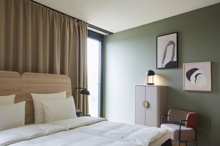 Der Hafenpark ist ein neues Quartier und als Teil des Frankfurter Grüngürtels von Bepflanzung, Liegewiesen und Wildblumen geprägt. Diesen urbanen Garten greift das Design des Hotels im Interior auf. Durch den Einsatz von Zimmerpflanzen sowie der Verwendung natürlicher Farben und Materialien verwischen die Grenzen zwischen drinnen und draußen.