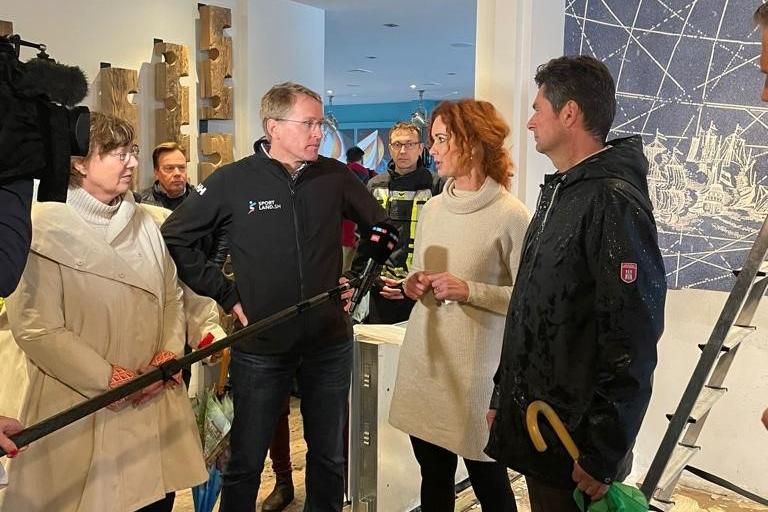 Das Hotel Hafen Flensburg hat es besonders schlimm erwischt, einen Eindruck der Zerstörung durch die Sturmflut machte sich am Dienstag. Ministerpräsident Daniel Günther vor Ort und hörte sich die Erwartungen von Hotelgeschäftsführerin Kirsten Herrmann für ihr Haus und andere Betroffene an: Finanzielle Unterstützung, rasche Hilfe und wirkungsvolle Prävention sind jetzt am wichtigsten. Kirsten Herrmann hat das Wohl aller Betroffenen im Auge und kann ein wenig aufatmen, als der Ministerpräsident deutliche Signale für unbürokratische Unterstützung gibt.