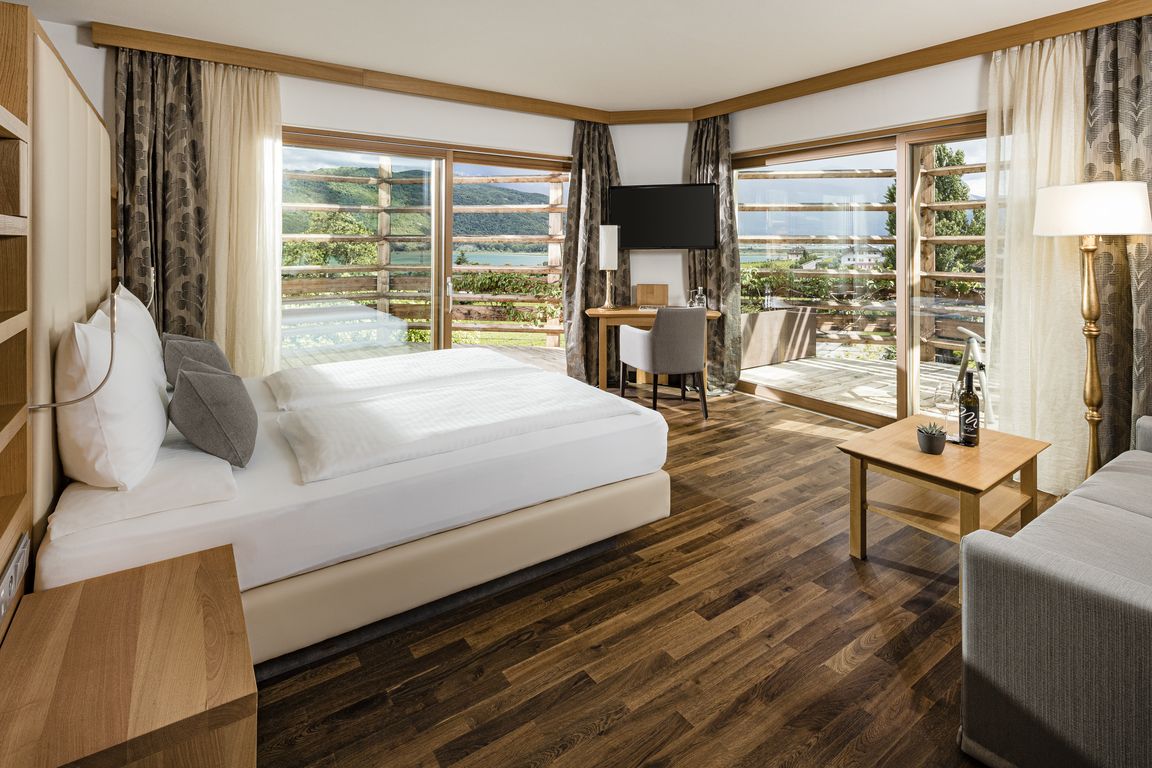 Helle Farbtöne, natürliches Grün durch lebende Wände und eine überlegte Bepflanzung dominieren das Design. Eine Glasfront stellt die Verbindung zur Natur her. Weiteres Highlight ist das Adults-Only-Spa Sensea, das auf zwei Etagen mit Blick auf den Kalterer See entsteht. Ergänzend dazu steht die Sonnenterrasse mit zusätzlichem In- und Outdoor-Infinity-Pool sowie Sandstrand nur für Erwachsene bereit.