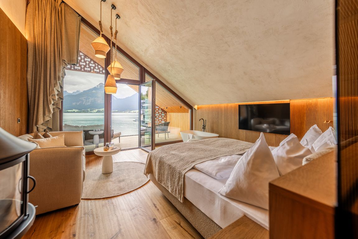Viel zeitloses Holz in verschiedenen Strukturen, warme Farben und weiche Stoffe sorgen im Innenbereich für ein wohnliches Gefühl. Individualität lautet das Credo bei den Zimmern, die sich über 15 verschiedene Kategorien erstrecken und von denen acht neugestaltet sowie sieben weitere renoviert wurden. So sind die Holzvertäfelungen in jedem Zimmer anders, im neuen Bereich spiegeln sie beispielsweise geriffelt den Wellengang im Wolfgangsee wider. Auch die blaue Farbe des Wassers spielt in den neuen Zimmern Azur Traum und Azur Suite mit weißen Himmelbetten eine große Rolle. Außerdem hinzugefügt wurden die zweistöckige Kategorie See Nest Suite mit gepolstertem Schlafbereich und zwei Meter großen Betten sowie die See Loft Suiten mit großen Saunen, eigenem Kamin und weitläufigen Terrassen mit viel Privatsphäre. Als Highlight eröffnen alle neugestalteten Zimmer einen direkten Blick auf den See, sowohl vom Bett als auch von Waschbecken, Dusche oder Sauna.