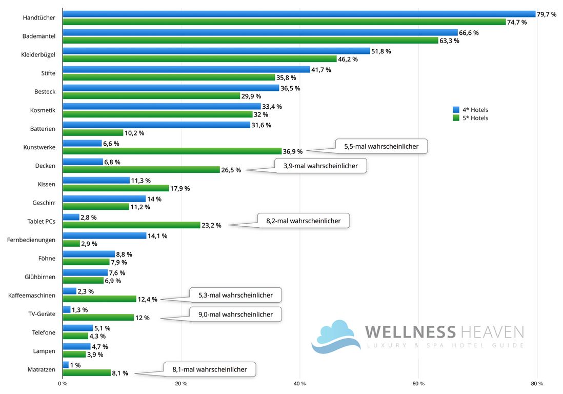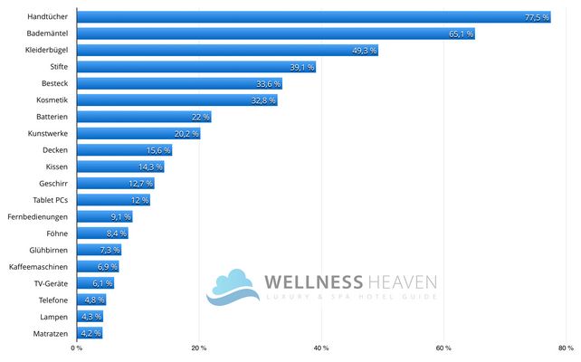 Die Hoteltester von Wellness Heaven befragten europaweit 1.093 Hoteliers über ihre Bilanzen des gestohlenen Hoteleigentums. Zu den 4-Sterne-Spitzenreitern zählen Handtücher und Bademäntel, gefolgt von Kleiderbügeln, Stiften und Besteck. Fernbedienungen und Batterien landen ebenfalls gern im Reisegepäck. Gäste der 5-Sterne Hotels hingegen betreiben die Klauerei auf luxuriösem Niveau. Kunstwerke, Fernsehgeräte und Tablets, Matratzen und Bettdecken zählen zur beliebtesten Beute.