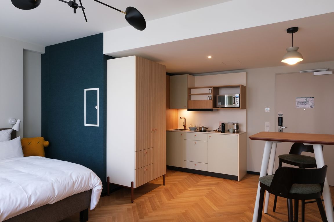 Und so bieten auch die „Hood House“ Apartments in Kassel viel Zuhause in Größen von 21 bis 41 Quadratmetern. Die Innenarchitektur orientiert sich am Charakter des in den Fünfzigerjahren entstandenen Gebäudes. Das Design der lichtdurchfluteten Wohnräume besticht zudem durch Ausstattungsmerkmale wie einen Fischgrät-Holzfußboden aus Eiche, hochwertige Einbaumöbel einer norddeutschen Tischlerei und Smart TV sowie Soundbar. Im Bad setzen messingfarbene Armaturen stilvoll-moderne Akzente. Jede Pantryküche verfügt über einen Herd mit Dunstabzug, eine Mikrowelle, einen großen Kühlschrank mit Gefrierfach sowie Geschirr. 14 Apartments haben einen Terrassenzugang. Im Obergeschoss des Gebäudes sind Waschmaschinen mit Trocknerfunktion vorhanden, die per App buchbar sind.