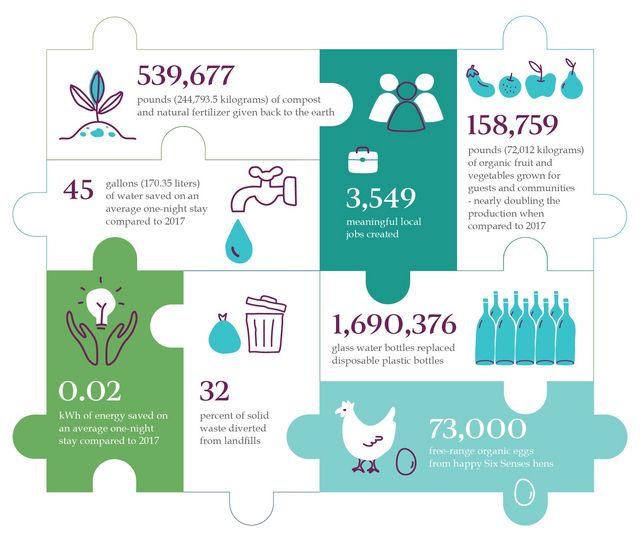 Umweltbewusstsein und soziale Verantwortung bedeuten auch messbare Aktionen. Seit 2012 sammelt Six Senses deshalb Daten aus verschiedenen Bereichen: Von der Reduzierung, Wiederverwendung und dem Recycling von Abfällen, über Lebensmittelherstellung bis hin zur Unterstützung der Gemeinde, der Herstellung des hauseigenen Wassers, des Verzichts auf Plastik und dem Schutzes des Ökosystems.
