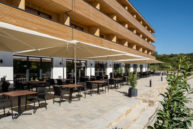 Die 104 Zimmer und Suiten des neuen Hotels haben eine Größe von rund 20 bis 40 Quadratmeter. Dazu wird es fünf „Weinfass-Suiten“ geben, in denen die Gäste in überdimensionalen Weinfässern übernachten. Der SPA-Bereich, der ab dem 21. September zur Verfügung steht, bietet einen Pool, der von innen nach außen reicht, verschiedene Saunen, ein separates Solebad sowie Massage- und Wellnessanwendungen. Die Liegeflächen in verschiedenen Ruhezonen und auf der Dachterrasse bieten einen Blick über die Weinberge und über die Silhouette der Stadt Volkach.
