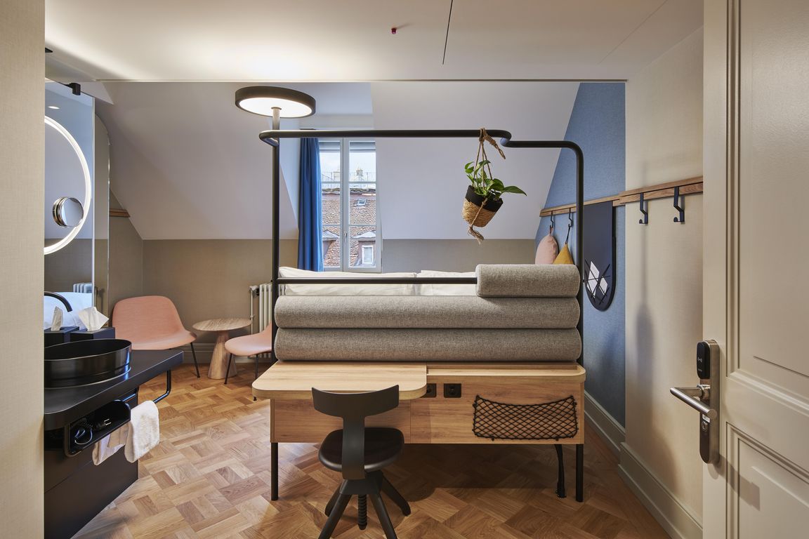 Die Gäste können zwischen sechs Zimmerkategorien wählen – vom Single Room mit französischem Bett über Doppelzimmer in verschiedenen Größen bis hin zu den Familienzimmern für bis zu vier Personen. Charakteristisch für die Marke gibt es auch in den Zimmern ein flexibles Element: Diese sind mit einem speziell designten Bettmodul ausgestattet, das auch einen Schreibtisch, ausziehbare Ablagen, Leuchten und eine integrierte Hakenleiste umfasst. An dieser können Gäste, neben Kleidern, auch Kissen, den Kofferbock, Taschen, die Laptop- Arbeitsunterlage und vieles mehr aufhängen und somit Platz schaffen.
