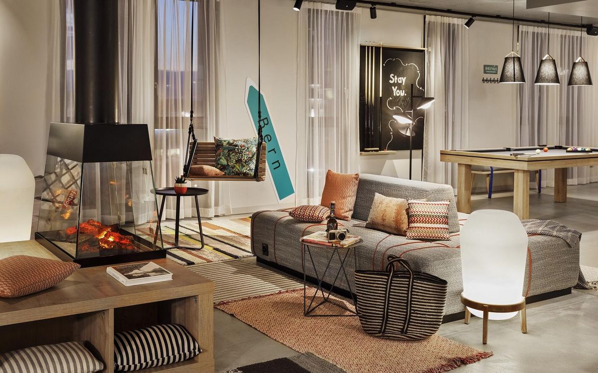Die Gemeinschaftsfläche des Hotels bildet das Wohnzimmer: Der offene Raum ist Begegnungszone, Arbeitsraum und Rückzugsort. Hier sind auch die Hosts daheim, die sich als Gastgeber um das Wohlbefinden der Bewohner kümmern. Eine offene Gemeinschaftsküche mit einem langen Tisch lädt zum Verweilen und Arbeiten ein. Gewächshaus, Cheminée und gemütliche Sitzgelegenheiten erinnern an das lebendige Treiben in urbanen Hinterhöfen. Ein weiteres Highlight ist die Dachterrasse mit Blick in die Alpen.
