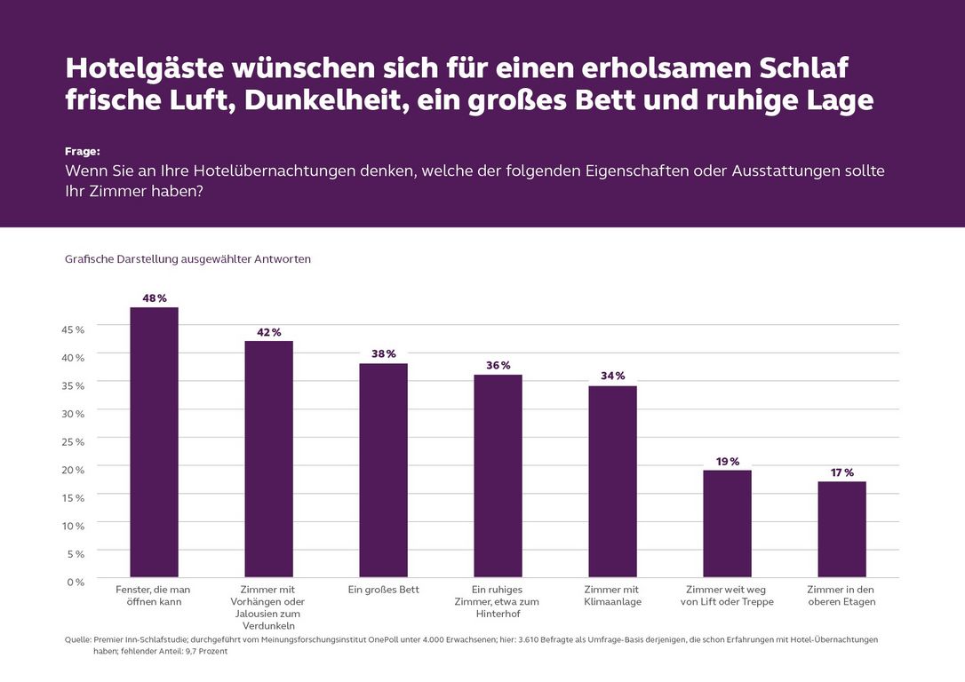 Für die repräsentative Schlafstudie des Hotelbetreibers Premier Inn befragte das Meinungsforschungsinstitut OnePoll bundesweit 4.000 Erwachsene, von denen nur 9,7 Prozent keinerlei Erfahrungen mit Hotelübernachtungen hatten und daher keine Auskunft geben konnten.