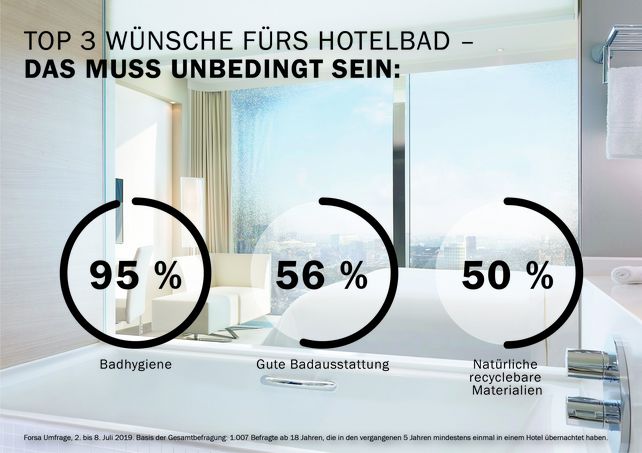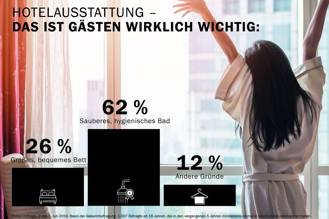 Ob im Urlaub oder auf Geschäftsreise, was Gästen im Hotelzimmer wirklich wichtig ist, ist ein sauberes, hygienisches Bad. Dies zeigt eine forsa Umfrage im Auftrag von Kaldewei. Gefragt nach dem wichtigsten Ausstattungsmerkmal eines Hotels, nannten fast zwei Drittel der Befragten (62 Prozent) ein sauberes Bad. Mit großem Abstand folgen ein großes, bequemes Bett (26 Prozent) und andere Ausstattungsoptionen. Allerdings gibt es in Hotels viele Störfaktoren, die die Freude über den Hotelaufenthalt schmälern. Die Antworten zu den „Pain Points“ zeigen, was Gäste wirklich verärgert, wie Hotelbetriebe das Risiko einer schlechten Bewertung durch den Gast minimieren können, was es zu vermeiden gilt und welche Investitionen sich für Hoteliers wirklich lohnen.