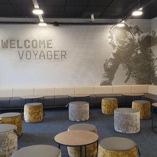Das Motto „WELCOME VOYAGER“ prangt in großen Buchstaben auf der Textiltapete im großzügigen Loungebereich des Hostels „HOME“, der im modernen Spacelook gestaltet ist. Wie Astronauten, die durch die Weiten des Universums reisen, finden sich auch die Gäste oft weit weg von ihrem Heimatplaneten. Besonders internationale Studierende sowie Gäste der Hochschulen finden im „HOME“ eine temporäre und kostengünstige Unterkunft. Auch Praktikant*innen, Tourist*innen und Geschäftsreisende sind herzlich eingeladen – hier findet jeder seinen persönlichen Space.