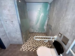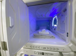 Im Innenbereich wird das Thema Weltraum konsequent umgesetzt und begleitet die Gäste von der Lounge über die Flure und Zimmer bis in den Keller des Gebäudes. Hier, im futuristischen Schlafkapselbereich, können die Gäste durch mehrere Ausgucke ins All blicken. Die Tiny-Zimmer sind mit zahlreichen Gadgets sowie cleveren Staumöglichkeiten und innovativen Badlösungen ausgestattet, wie etwa einer im Spiegel integrierten Infrarotheizung. Die Badezimmertür dient gleichzeitig als Duschkabinentür – ein wahres Meisterwerk der Ingenieurskunst, das selbst die Crew der Enterprise beeindrucken würde.