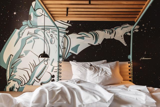 Für das charakteristische Innendesign sind Laura Karasinski vom Atelier Karasinski und Gerd Zehetner von archiguards verantwortlich. In den 17 verschiedenen Zimmerkategorien warten ausgefallene Designs auf die Gäste – so zum Beispiel die ungewöhnlichen Stockbetten in den Familienzimmern oder die Themenbuden mit großem Gemeinschaftsbett.