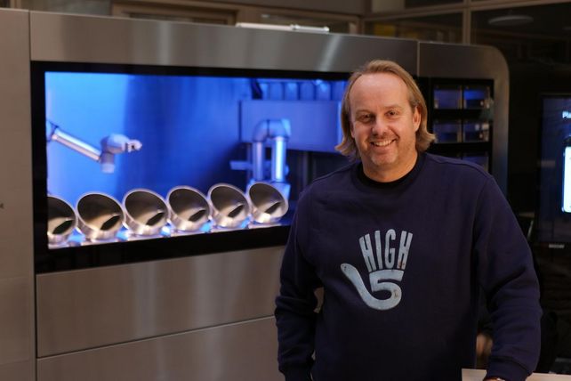 Obwohl dort, wo einst der Roboter stand, jetzt ein blaues Sofa steht, will der Hotelier weiter digitalisieren und denkt über Roboter nach, die Eis oder Pasta zubereiten.