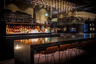 Auf der Rooftop befindet sich die zweite Bar des Hauses. Hier erstrahlt die Hamburger Skyline durch Materialien aus goldenem Mesh, die sich in den Glasoberflächen widerspiegelt. Die Auswahl an Möbeln lässt die Gedanken zu vergangenen Zeiten schweifen. Zwischen lässigen Loungemöbeln von Baxter und Wittmann finden sich modern interpretierte Möbelklassiker. Die Outdoorterrasse lädt zum Geniessen des Sonnenuntergangs, beim DJ-Abend „Sounds in the Clouds“ oder zum Rooftop-Yoga mit Blick auf das Kontorhausviertel ein.