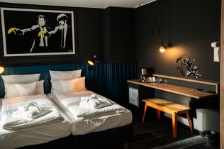 Nun hat das me and all hotel mainz zusammen mit der Ausstellung „The Mystery of Banksy – A Genius Mind“ eines seiner Studios als Pop-Up-Zimmer mit Werken von Banksy designt. Hier erleben die Gäste ein Zimmer mit Kunst zum Anfassen und schlafen inmitten von verschiedensten Banksy-Werken.