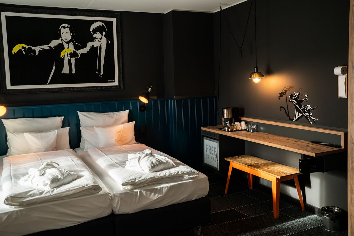 Das 162-Zimmer-Hotel hat dafür zusammen mit den Gestaltern der Ausstellung eines der Studios für bis zu vier Personen als „The Mystery of Banksy Room“ designt. Ein Bild hinter dem Boxspring-Bett zeigt das berühmte Werk „Pulp Fiction“ von 2002, eines seiner frühesten Schablonengraffitis aus London. Es zitiert den legendären Quentin Tarantino-Film, nur um den Protagonisten Vincent und Jules (John Travolta und Samuel L. Jackson) statt Waffen Bananen in die Hand zu drücken.