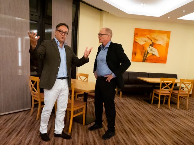Auch Hotelinhaber Achim Kniese ließ es sich nicht nehmen, bei diesem ganz besonderen Projekt mitzumischen. Der Gastgeber spielte sich selbst und führte in der Rolle des Hotelmanagers Ullmann den neuen Nachtwächter durch das Haus.