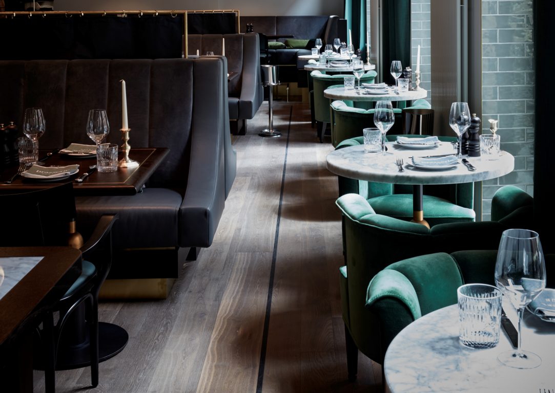 In den Restaurants und Bars des Tortue Hamburg empfängt den Gast dann ein anderes Design. Keine Geringere als die in Hong Kong ansässige Joyce Wang wählte für das asiatische Restaurant Jin Gui ein dunkleres und verführerisches Interieur - geschickt unterbrochen von kleinen Zweier-Sofas, bezogen mit einem grafischen, wandteppichgleichen Stoff. Mit saisonalen, und wann immer auch möglich biodynamischen, Gerichten werden die Gäste hier, in der Glasveranda und auf der Terrasse im Innenhof verwöhnt. Andernorts ist die französisch-deutsche Brasserie gekennzeichnet von schwarzen Metrofliesen, geschwungene Sitznischen und Marmortresen. Hingucker ist auf jeden Fall das Kunstwerk aus Mosaikfliesen von Emma Biggs hinter der offenen Küche. Dass will Tortue beliebter Treffpunkt der Gesellschaft werden und setzt dabei auch auf drei Bars – allen voran der von Stephen Williams designten „bar noir“ und Hume’s „bar bleu“ nahe der Lobby. Um dem ganzen noch die Krone aufzusetzen, eröffnet später im Jahr die Dachterrassen-Bar. Und wie soll es anders sein – auch hier heißt es sich Zeit nehmen und den Blick auf die von Herzog & de Meuron entworfene Elbphilharmonie zu genießen.