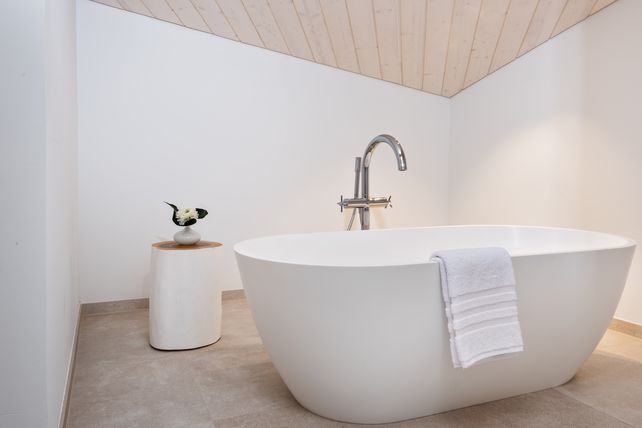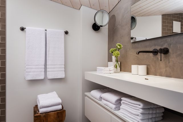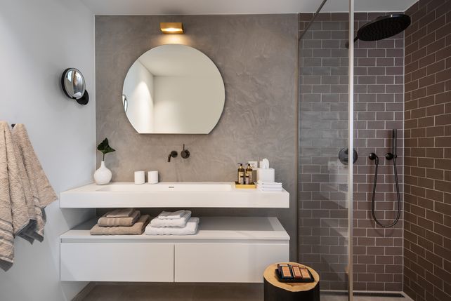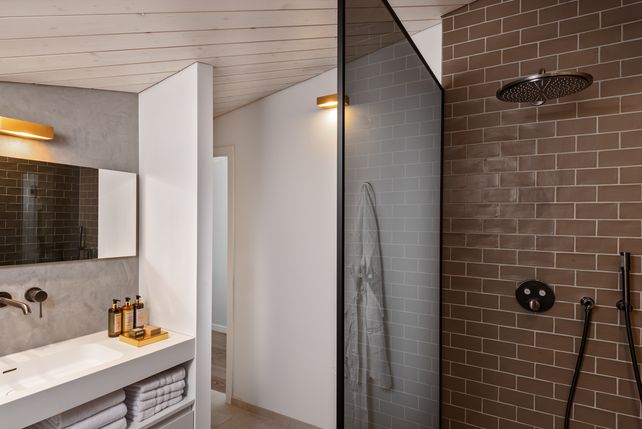 Das Farbkonzept ist stark von der unmittelbaren Umgebung inspiriert. Die Wohnzimmer erinnern an das, was der Blick aus den Fenstern zeigt. Die satten Grüntöne vom Wald nebenan, das je nach Wetter in unterschiedlichen Blautönen schimmernde Wasser des Brienzersees und das Grau und Weiss des Jungfrau-Massivs finden sich in den modernen Räumen wieder. Jeulink arbeitet mit einzelnen Akzenten in den Farben Ocker und Pink, um den Wohnzimmern die Tiefe und Gemütlichkeit eines persönlichen Zuhauses zu geben. Die Schlafzimmer sollen den Gast zur Ruhe kommen lassen und so ist die Farbgebung in Grau, zartem Grün und Blau dezent und beruhigend gehalten. Gleiches gilt für die Bäder, in denen eine Regenwalddusche oder eine frei stehende Badewanne zur Entspannung nach einem Bergabenteuer einladen. Hier dominieren sanfte Grau- , Sand- und Weisstöne.