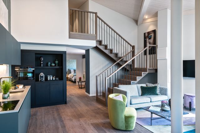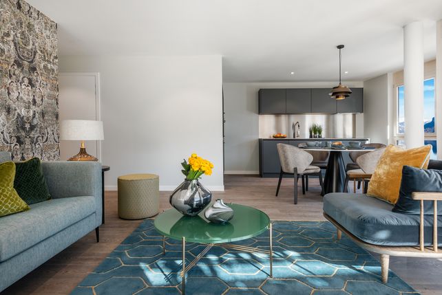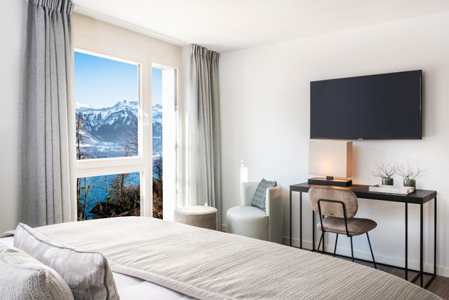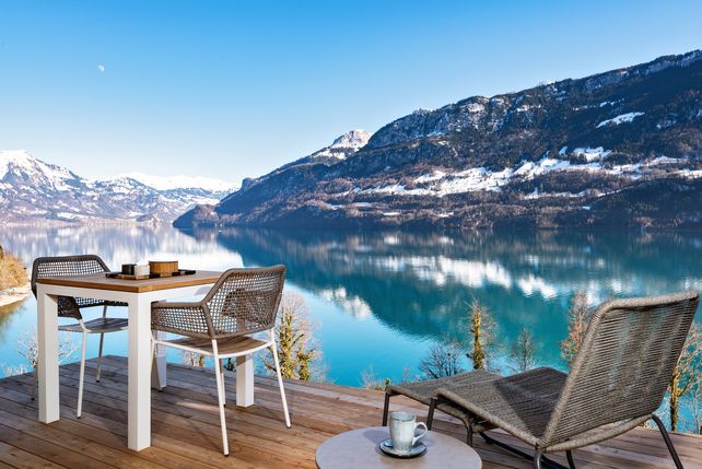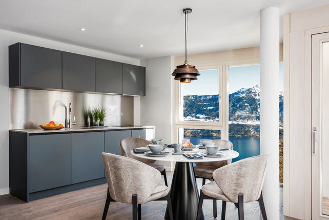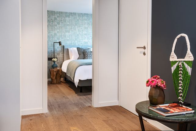 Die Möbel und Accessoires sind handverlesen, Astrid Jeulink bezieht sie von kleineren Manufakturen aus der ganzen Welt. Als passionierte Reisende lässt sie sich unterwegs von fremden Kulturen inspirieren und bringt gerne das eine oder andere Lieblingsstück mit nach Hause. Sie kann sich daher gut in Hotelgäste hineinversetzen und versteht deren Bedürfnisse. Dies kommt in den Apartments zum Tragen. Die Ausstattung ist in erster Linie praktisch und funktional. So sind beispielsweise die Küchenabdeckungen aus einem neuen, smarten Material: Auf einer extrem matten Oberfläche hinterlassen auch fettige Hände keine Fingerabdrücke. Dass Funktionalität und Sexiness sich nicht ausschließen müssen, ist hier bereits auf den ersten Blick erkennbar. Das gilt auch für das persönliche Lieblingsstück der Designerin: „Mein Style-Highlight steht im Wohnzimmer der Musterwohnungen. Der aus Eichenholz gefertigte Flychair von &Tradition vereint für mich alles, was ein modernes Möbelstück mitbringen soll. Er ist bequem genug, um stundenlang darin zu sitzen und den See mit den Bergen dahinter zu bestaunen. Und trotzdem ist der funktionale Sitzplatz zugleich ein Kunstobjekt, was die Raumatmosphäre spürbar aufwertet.“