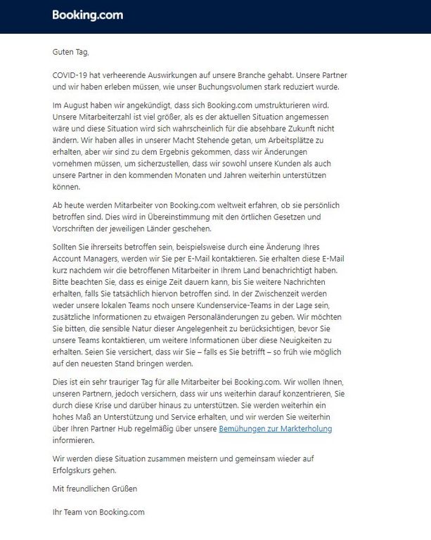 Hoteliers, die fortan ohne Account Manager dastehen würden, versichert Booking diese per Mail zu kontaktieren, was allerdings einige Zeit dauern könnte. In der Zwischenzeit seien weder die lokalen Teams noch die Kundenservice-Teams in der Lage, zusätzliche Informationen zu etwaigen Personaländerungen zu geben, schreibt Booking und weist auf die „sensible Natur“ dieser Angelegenheit hin.