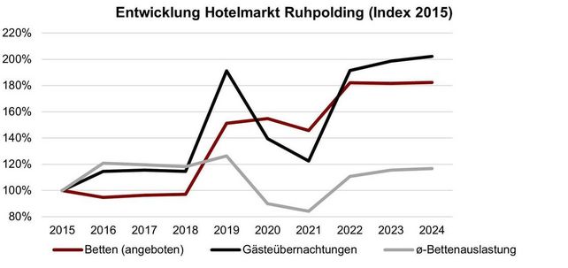 Die Gemeinde Ruhpolding im Landkreis Traunstein verzeichnete über Jahre stagnierende Übernachtungszahlen, obwohl die natürliche Attraktivität und die Bekanntheit als Biathlon-Standort hoch waren. Die Ursache lag laut Analyse in einer strukturellen Angebotslücke, da der Markt primär durch kleinteilige, privatgeführte Betriebe mit einer durchschnittlichen Größe von 50 Betten geprägt war. Mit der Eröffnung des aja Ruhpolding im Mai 2019 erhöhte sich die Bettenkapazität schlagartig um 56 Prozent. Entgegen der Befürchtung einer Marktsättigung stieg die Zahl der Übernachtungen noch im selben Jahr um 67 Prozent an. Die durchschnittliche Auslastung des gesamten Standorts verbesserte sich zeitgleich um 3 Prozentpunkte. Trotz der Pandemiejahre hat sich das Übernachtungsvolumen im Zeitraum von 2015 bis 2024 insgesamt mehr als verdoppelt.