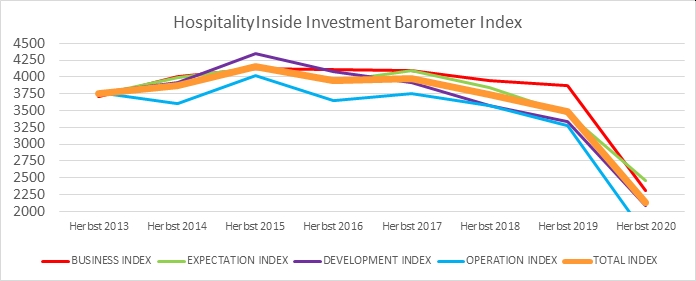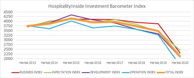 Die Erwartungen für die Hotel-Branche zeigen ein deutlich schlechteres Bild: Der Development Index fällt um 37,43 Prozent von 3.340 auf 2.090 Prozent, der Operation Index um 49,24 Prozent (von 3.270 in 2019) auf 1.660 Prozent in 2020.