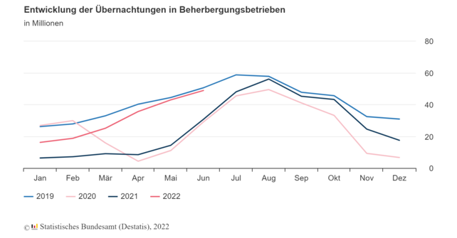 Die Zahl der Übernachtungen von Gästen aus dem Inland stieg im Juni 2022 im Vergleich zum Juni 2021 um 48,6 Prozent auf 42,5 Millionen. Die Zahl der Übernachtungen von Gästen aus dem Ausland erhöhte sich gegenüber dem Vorjahresmonat sogar um 245,3 Prozent auf 6,4 Millionen. Gegenüber Juni 2020 nahmen die Übernachtungszahlen für Gäste aus dem Inland um 54,5 Prozent und für Gäste aus dem Ausland um 299,0 Prozent zu. Gegenüber dem Juni des Vorkrisenjahres 2019 lag die Zahl der Übernachtungen von Gästen aus dem Inland leicht höher (+0,3 Prozent), die Übernachtungen von Gästen aus dem Ausland noch 22,2 Prozent niedriger.