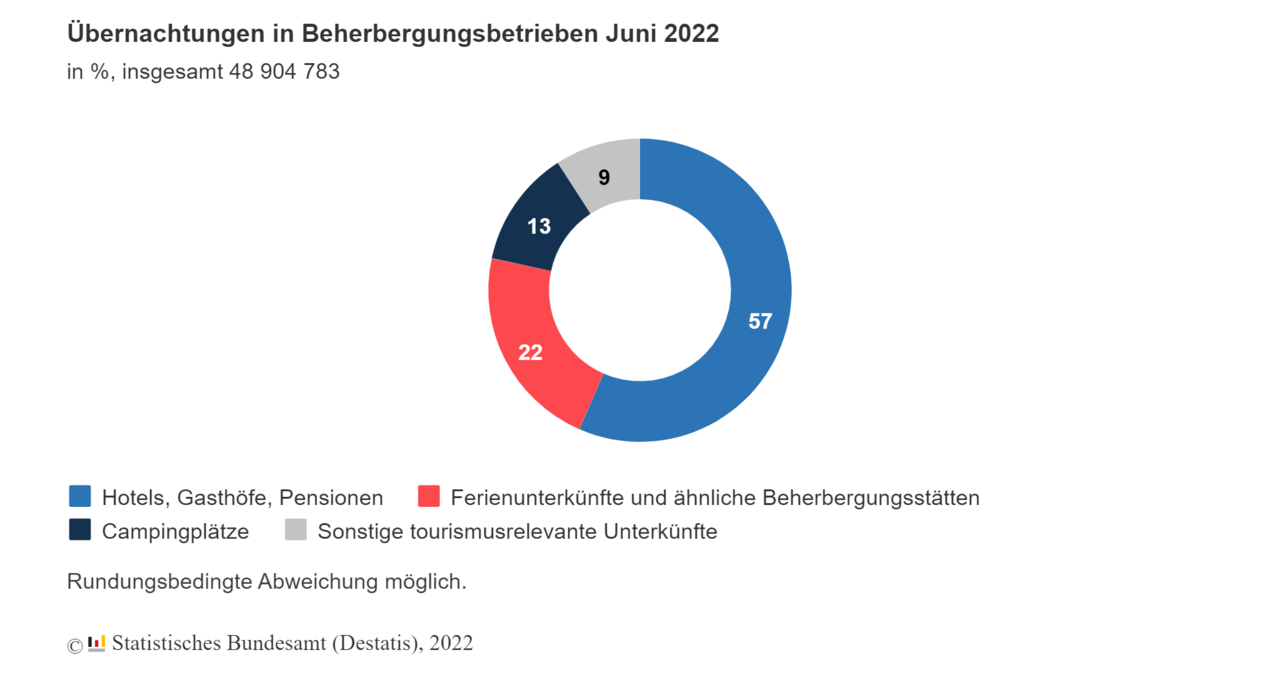 Untergliedert nach Unterkunftstypen entfielen im Juni 2022 knapp 56,5 Prozent der Übernachtungen auf Hotels, Gasthöfe und Pensionen (Hotellerie), 21,8 Prozent auf Ferienunterkünfte und ähnliche Beherbergungsstätten sowie 12,5 Prozent auf Campingplätze. Sonstige Unterkünfte wie Vorsorge- und Rehabilitationskliniken und Schulungsheime machten 9,1 Prozent der Übernachtungen aus. Im Vergleich zum Juni des Vorkrisenjahres 2019 nahmen die Übernachtungen in der Hotellerie um 4,5 Prozent und in sonstigen Unterkünften um 9,5 Prozent ab. Die Übernachtungen in Ferienunterkünften (+0,6 Prozent) und auf Campingplätzen (+0,1 Prozent) lagen auf Vorkrisenniveau.