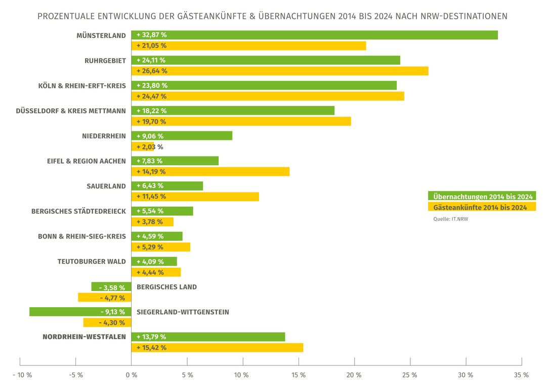 Im landesweiten Vergleich der zwölf Tourismusregionen liegt das Münsterland damit vor den Reisegebieten „Ruhrgebiet“ (+24,1 Prozent), „Köln und Rhein-Erft-Kreis“ (+23,8 Prozent) und „Düsseldorf und Kreis Mettmann“ (+18,2 Prozent). Neben den Städteregionen führt das Münsterland auch die Statistik unter den ländlichen Regionen vor dem „Niederrhein“ (+9,1 Prozent), dem „Sauerland“ (+6,4 Prozent) und dem „Teutoburger Wald“ (+4,1 Prozent) an.