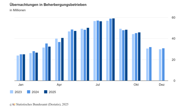 Der positive Trend im Oktober 2025 wurde von nationalen und internationalen Gästen getragen, wenn auch in unterschiedlicher Stärke. Die Zahl der Übernachtungen von Gästen aus dem Inland stieg um 0,7 Prozent auf 38,6 Millionen. Im Gegensatz dazu sorgten Gäste aus dem Ausland für ein Wachstum von 4,1 Prozent und verbuchten insgesamt 7,3 Millionen Übernachtungen. Damit war der Anstieg bei den Übernachtungen von ausländischen Gästen prozentual deutlich stärker ausgeprägt als bei inländischen Gästen.
