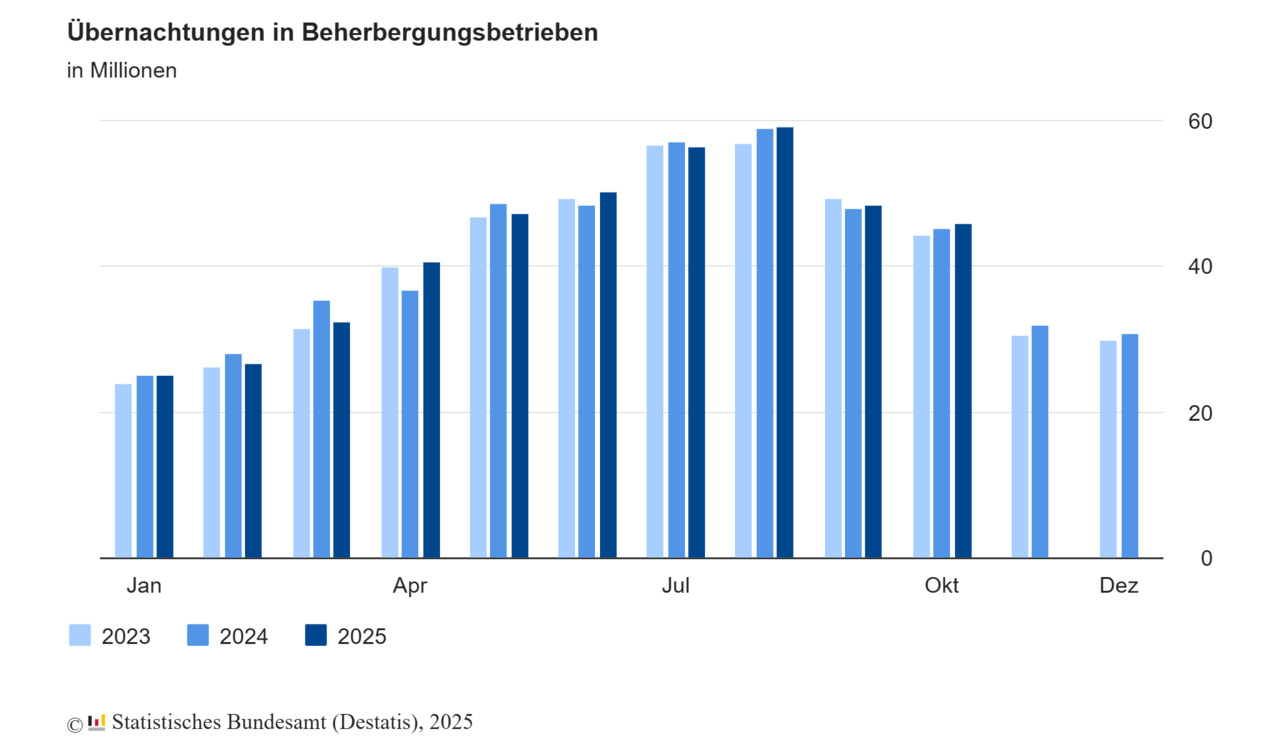 Die Beherbergungsbetriebe in Deutschland verzeichneten im Oktober 2025 insgesamt 45,9 Millionen Übernachtungen. Wie das Statistische Bundesamt nach vorläufigen Ergebnissen mitteilte, waren das 1,2 Prozent mehr als im Oktober 2024.