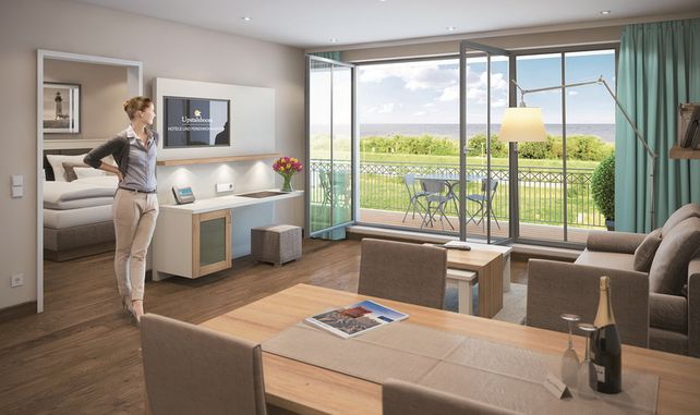 Der Innenausbau der modernen Gebäude fügt sich in den klassischen Charme der Bäderarchitektur. Dabei reichen die Apartment-Kategorien von der 47 qm großen Zwei-Zimmer-Apartmentsuite bis hin zum 115 qm großen Penthouse. Bodentiefe Fenster, die den Blick auf die Ostsee freigeben, voll ausgestattete moderne Küchen sowie große Balkone und Terrassen runden das exklusive Angebot ab.