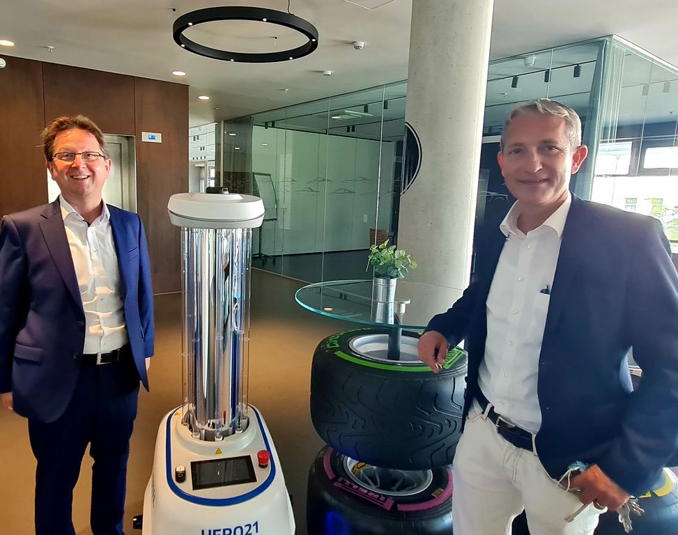 „Das kommt gut an“, berichtet Markus Hofherr, der zusammen mit Simeon Schad das automobilaffine Themenhotel führt. „Die Gäste fassen dadurch mehr Vertrauen zum Hotel und ein Hingucker ist es auch.“ Denn Hero21 kann so programmiert werden, dass er einen Gast persönlich begrüßt, ihn sogar mit dessen Namen anredet und über seine Desinfektionstätigkeit aufklärt.