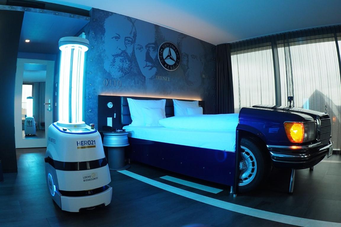 Im V8 Hotel in der Motorworld Stuttgart fährt derzeit ein Roboter selbstständig durch Zimmer und öffentliche Bereiche und befreit per UV-C-Strahlung Oberflächen und Raumluft von Bakterien, Pilzen und Viren. Für das Hotel eine Erleichterung im Housekeeping und ein Vorteil im Marketing, den es nun auch öffentlich über die DIRS21-Buchungsmaske kommuniziert.